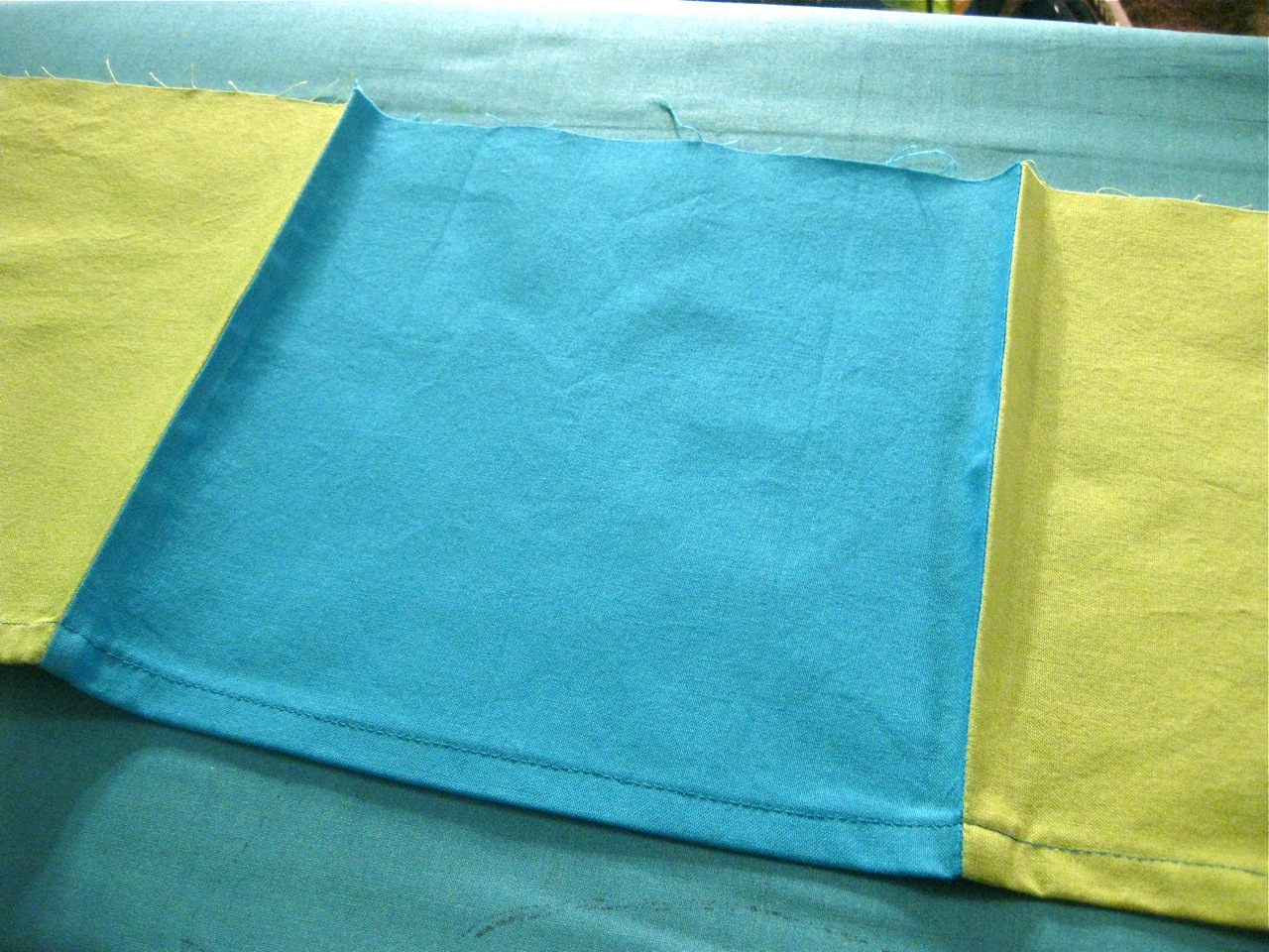 Now you need to sew it all together! Grab piece A and start with one of your long strips. Match its raw edge to the long raw edge of piece A. Make sure you leave about 1/2 inch of the broadcloth free on either side of the strip because you'll have to sew your shorter strips there. Sew piece A to the first long strip, then the other. Sew the shorter strips on last.